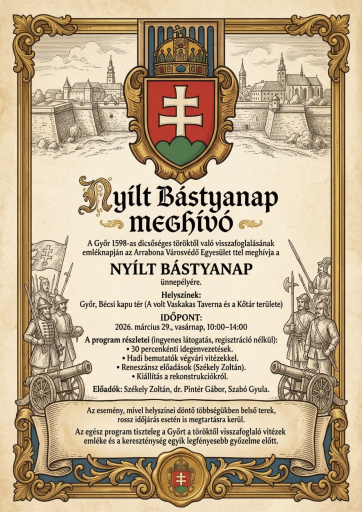 Győr várának 1598. március 29-én történt töröktől való visszafoglalásának emléknapján az Arrabona Városvédő Egyesület nyílt bástyanapot hirdet a győri Bécsi kapu téren a volt Vaskakas Taverna és a Rómer F. Múzeum Kőtára területén 2026. március 29-én. Mindkét helyszín ingyenesen látogatható, előzetes regisztráció nem szükséges. A program 10.00-kor kezdődik és 14.00-kor végződik. Az esemény alkalmával lesz 30 percenként idegenvezetés-helyszín ismertetés, hadi bemutatók hagyományőrző végvári vitézekkel, valamint meghallgatható az e kort leíró előadás.